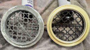 De plafondroosters konden wel een grondige schoonmaakbeurt gebruiken. Op de linkerfoto zijn beide roosters stofvrij gemaakt, waarbij het rechterrooster al voorzien is van een nieuwe verflaag.